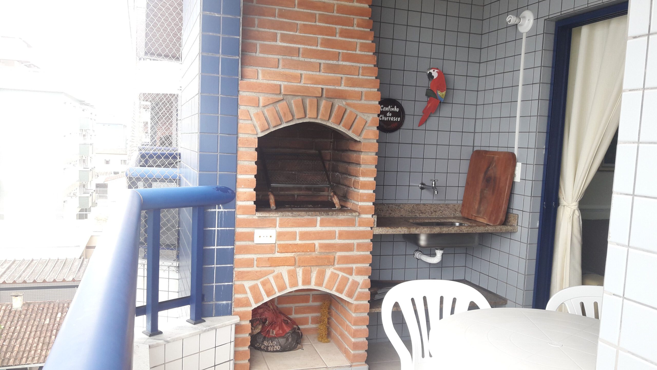 Sacada gourmet com churrasqueira, mesa e banquetas;