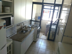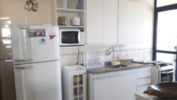 Com pequena vista do mar pela sacada, quarto e cozinha